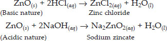 SOLUTION:Ans.: These are the oxides which can act both as acids and bases. For example, aluminium oxide (Al2O3) and zinc oxide (ZnO). The amphoteric character of zinc oxide is shown by the following reactions.