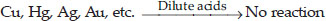 Metals such as Cu, Hg, Ag, Au, etc. which lie below hydrogen in the activity series are less reactive than hydrogen and hence cannot displace hydrogen from dilute acids.