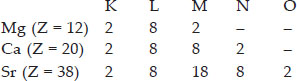 SOLUTION:Ans.: Only those elements are placed in the same group in which the gaps of atomic numbers are : 8, 8, 18, 18, 32. If we look at the atomic numbers of the elements that are listed, it becomes clear that the elements with atomic numbers 12, 20 (Ca), 38 fit into this pattern. They are placed in the same group and have also similar physical and chemical properties.