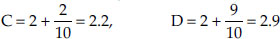 Write the decimal number represented by the points A, B, C, D on the given number line.