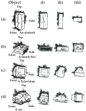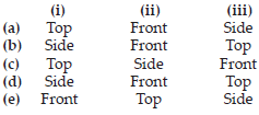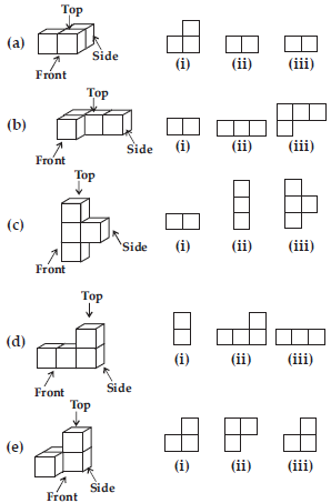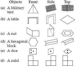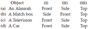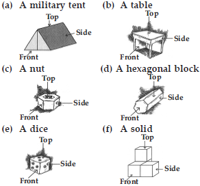 For each of the given solid, the three views are given. Identify for each solid the corresponding top, front and side views.