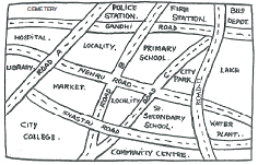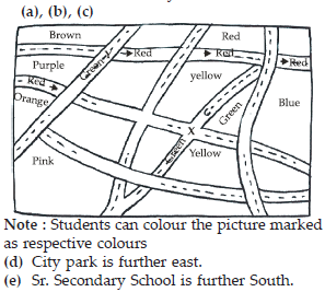 (a) Colour the map as follows : Blue-water, Red-fire station, Orange-library, Yellow-schools, Green-park, Pink-College, Purple-Hospital, Brown-Cemetery.