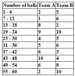 The runs scored by two teams A and B on the first 60 balls in a cricket match are given below: